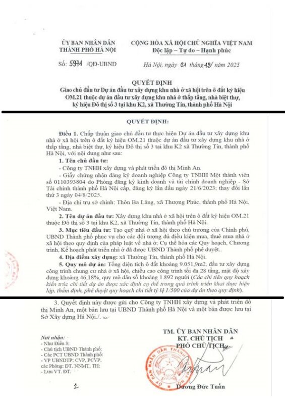 Ngày 01/12/2025, Công ty TNHH xây dựng và phát triển Đô thị Minh An chúng tôi vinh dự nhận Quyết định số 5971/QĐ-UBND do Ủy ban Nhân dân Thành phố Hà Nội ban hành, về việc giao chủ đầu tư thực hiện Dự án xây dựng khu nhà ở xã hội trên ô đất ký hiệu OM.21 thuộc dự án đầu tư xây dựng khu nhà ở thấp tầng, nhà ở biệt thự ký hiệu Đô thị số 3 tại khu K2, xã Thường Tín, thành phố Hà Nội.